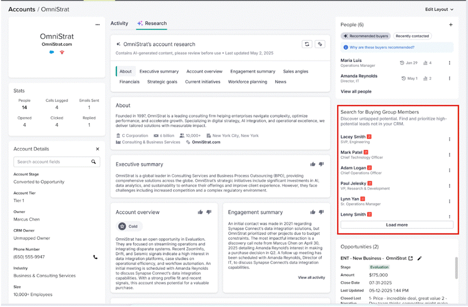 The Buyer Identification Agent recommends verified decision makers, including those not yet added to the CRM. It surfaces best-fit contact based on persona fit and account activity.