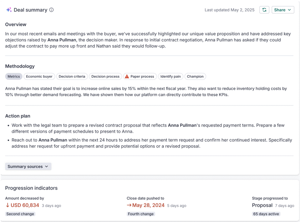 The Deal Summary Agent delivers an AI deal summary, including risks, engagement history, and next steps. The Conversations MEDDPICC extraction agent automatically pulls out insights from conversations and populates them into the methodology section of the deal summary to drive deal alignment and raise deal risks to sales leadership.
