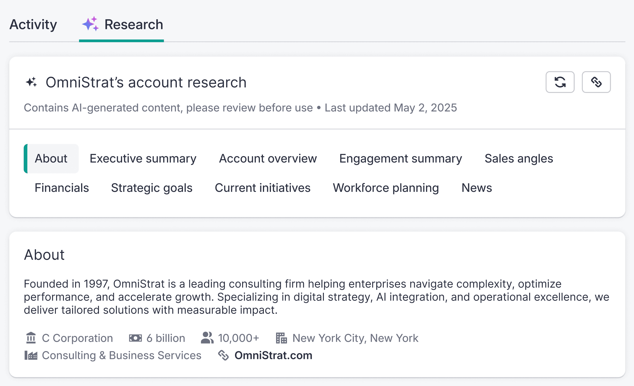 The Account Research Agent analyzes buyer signals, firmographic data, and CRM context, delivering a unified view with recommended messaging and account context. The Account Research Agent works with AI Emails for Cadences to compose personalized emails based on the buyer role, company, and research findings.
